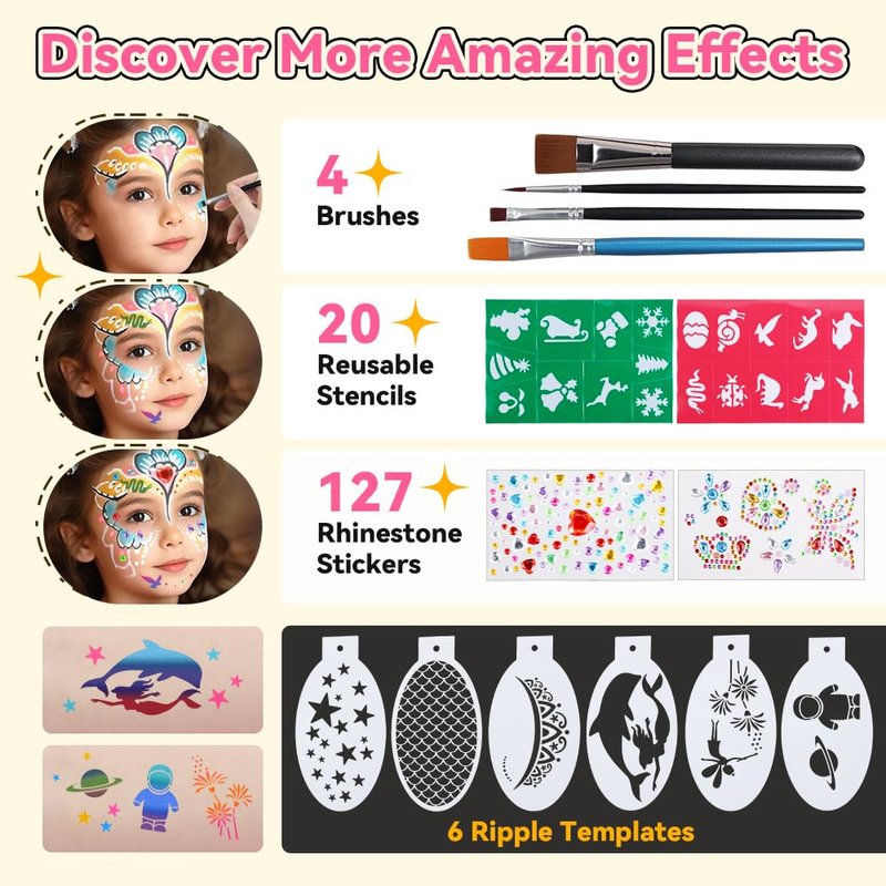- 🎨【Professional Rainbow Face Painting Kit】Janolia face paint kit contains 8 three-color stripes of face paint, 1 black face paint, 1 white face paint (26 colors in total), 6 reusable ripple templates, 2 reusable sticker templates, 2 rhinestone stickers, 4 brushes. Vibrant colors give you more space to paint. With the split cake palette, you can draw beautiful rainbow patterns, mermaid patterns, spaceships, and flag patterns. Warm tips: you need to wet the brush before applying the body painting.