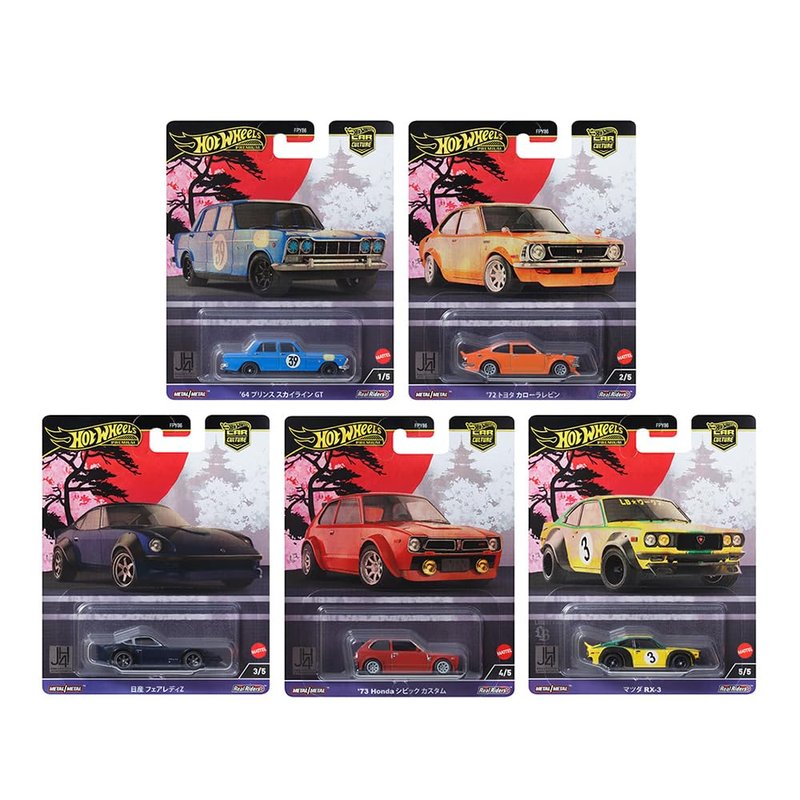 - 1) RX-3 #3 Yellow with Green Stripes. 2) Z RHD (Right Hand Drive) Dark Blue. 3) 1973 Custom RHD (Right Hand Drive) Red. 4) 1972 Levin RHD (Right Hand Drive) Orange. 5) Prince Skyline GT RHD (Right Hand Drive) #39 Blue Metallic.