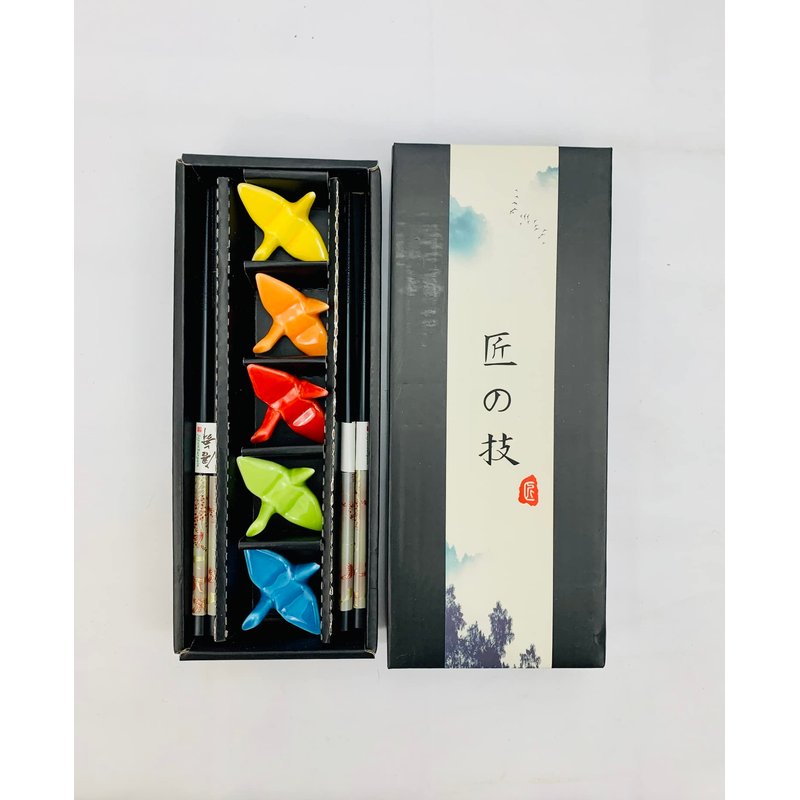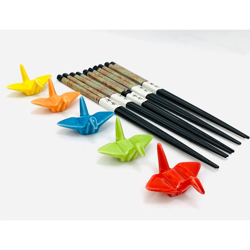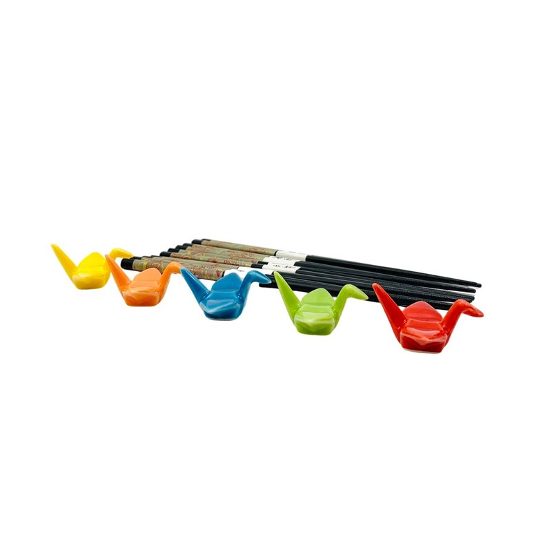 - This Chopstick and Rest Gift Set Comes 5 Pair Bamboo Chopsticks with Crane Print, and 5 Porcelain Origami Crane Shaped Chopstick Rest in Five Color, Yellow Crane, Orange Crane, Blue Crane, Lime Crane, Red Crane