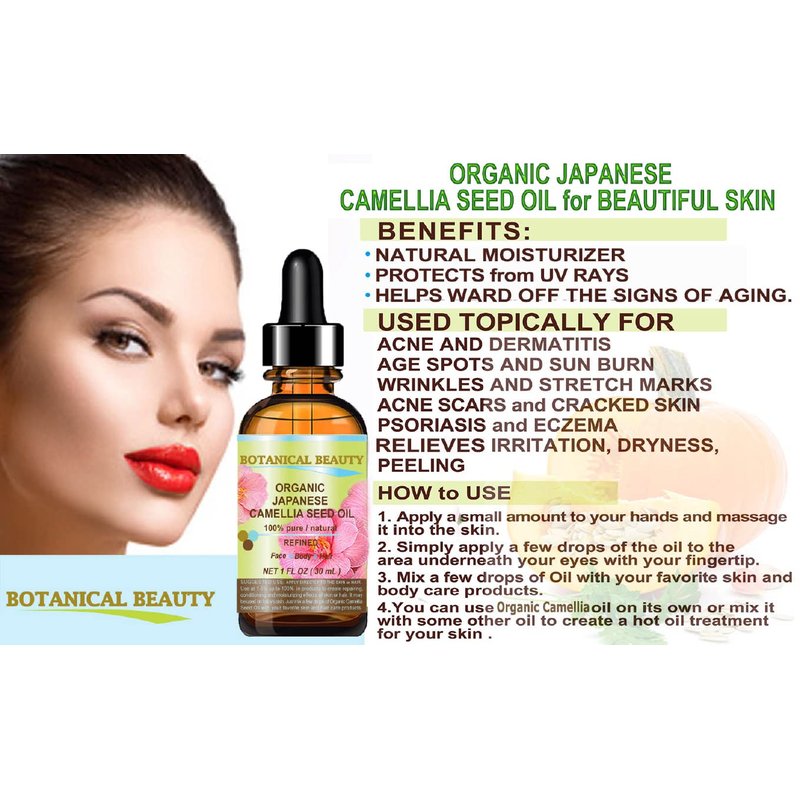 - Botanical Beauty Japanese ORGANIC CAMELLIA Seed Oil helps for dry, damaged hair, dry scalp and brittle nails.