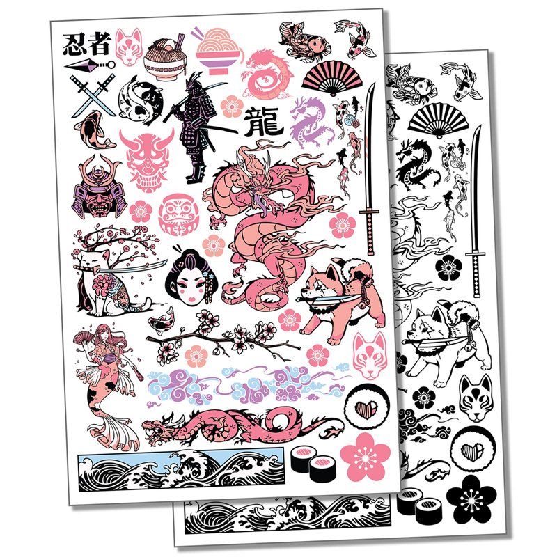Japanese Sakura Katanas and Dragons Temporary Tattoo Water Resistant Fake Body Art Set Collection - Color (One Sheet)