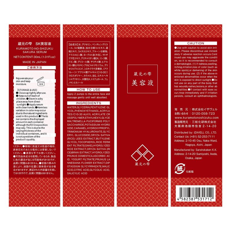 Japanese SAKURA Serum, Gel-base, Women&Men, Hydrating formula, Smooth skin, Cherry Blossom sakura extract, Vitamin C, AHA, “Kuramoto-no-Shizuku”, Paraben Free, Cruelty Free (1 month 1.01oz)