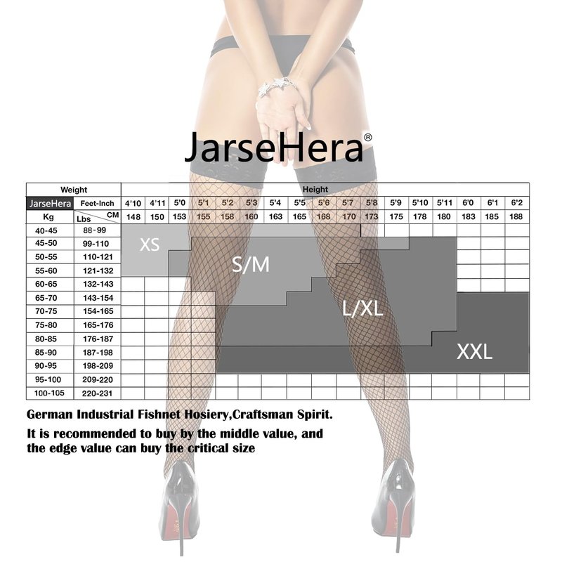 Now, in order to meet your needs, we have launched this fishnets stockings. JarseHera Stay Up Lace top Thigh high Fishnet stockings. We use German craftsmanship to pursue the ultimate quality, no back seam, DURABLE and NOT DEFORED, SILICONE LINED lace top Over-Knee Hosiery, get rid of the shackles of the garter and give you more freedom.