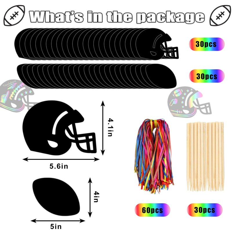 JarThenaAMCS 60Pcs Football Scratch Paper Craft Kits Football Helmet Scratch Cards Ornaments with Ribbon and Wooden Styluses for DIY Crafts Painting Classroom Party Supplies