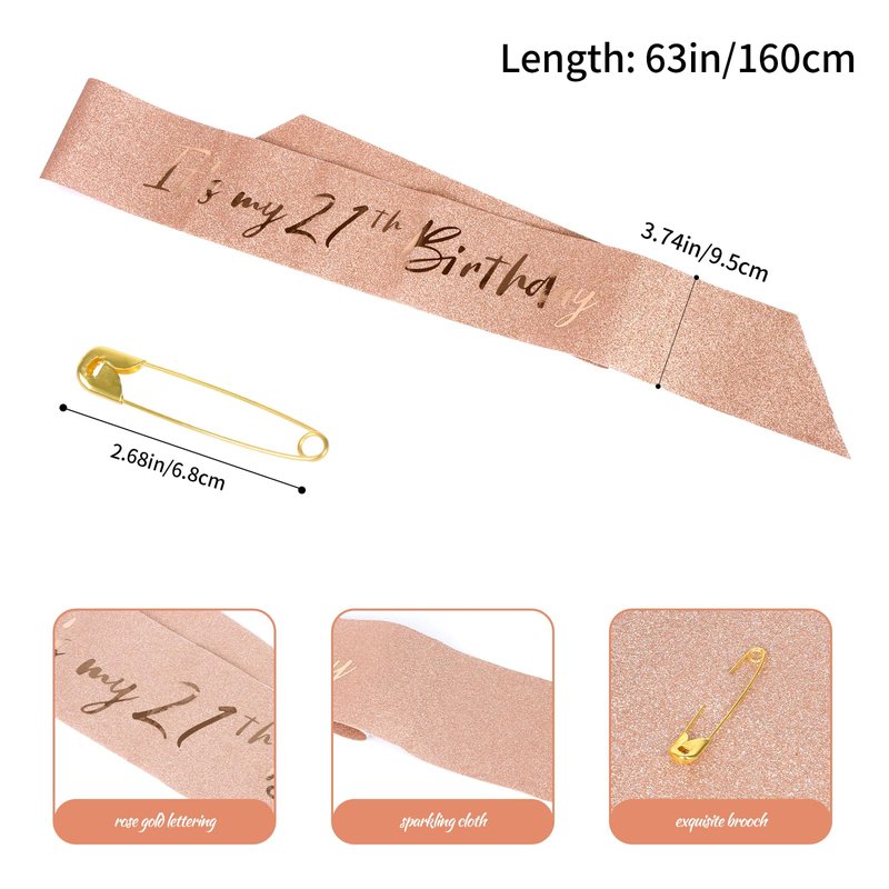 - 【Features】The rose gold birthday belt is made of high-quality glitter fabric and printed with rose gold foil characters. Elegant and gorgeous! The belt is 160 cm long and has a beautiful pearl pin.