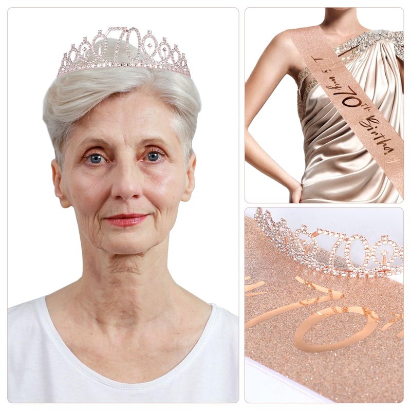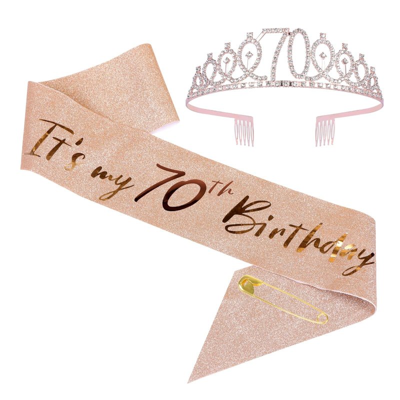 JasperKino 70th Birthday Sash and Tiara Set Rose Gold Birthday Sash Crown Birthday Party Favors Supplies for Girls Birthday Party