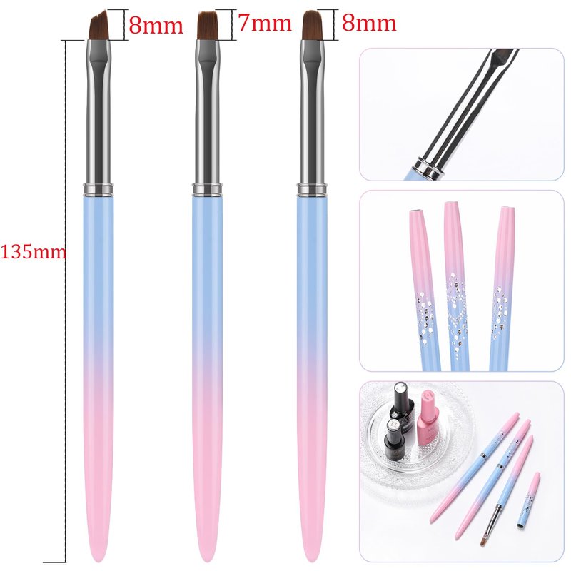 【Product Name】:nail art clean up brush 【Color】: gradient pink blue 【Style】: 3 shapes 【Body Material】: metal pen body 【Bristles Material】: synthetic bristles 【Overall Length】: 164mm 【Cap Length】: 65mm 【Packing List】: 3pcs/Set nail art clean up brush