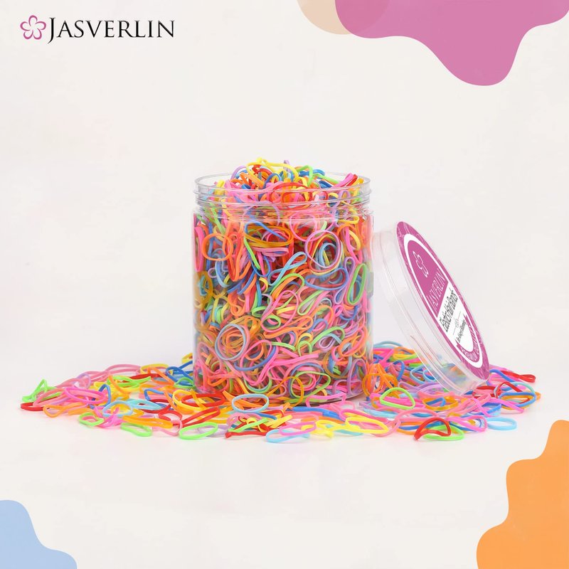 - ●ELASTIC TIE BAND VALUE PACK: This package of Jasverlin colorful hair bands arrives in a convenient portable jar to keep your elastics clean and tidy. Each package includes 1000 Multi-colored hair bands for everyone in your household. Store in your purse, gym, bag, car, and bathroom vanity.