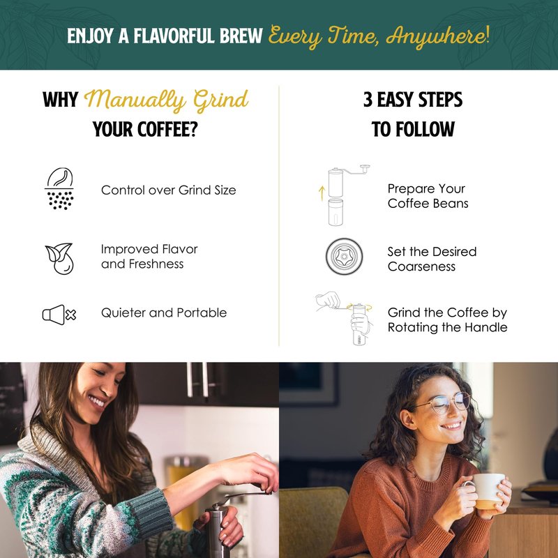 - ENHANCE YOUR MORNING WHILE MAKING AN IMPACT AROUND THE WORLD ― Your deliciously crafted cup of coffee from our manual coffee grinder is helping empower coffee farmers to chase a brighter future. A portion of our profits go towards positively impacting our partner’s coffee supply chain and their local communities. Our mission hinges on one fundamental idea: when we care, happiness flows and everyone wins. Including you with this hand coffee bean grinder by JavaPresse.