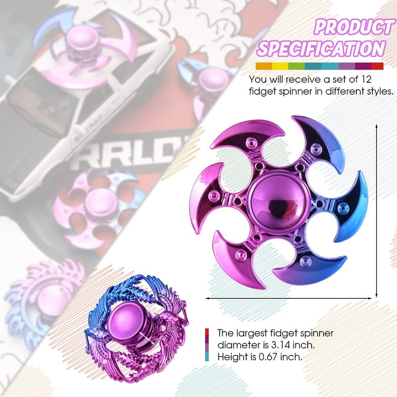 - 【DIVERSE SELECTION】Unbox a collection of 12 fidget spinners, each boasting a distinct and eye-catching design. From sleek and modern to playful and colorful, this assortment ensures there's something for everyone. Perfect for capturing attention and sparking curiosity, these spinners offer a delightful way to unwind and destress. Get ready to impress friends and enjoy endless moments of relaxation on the go!