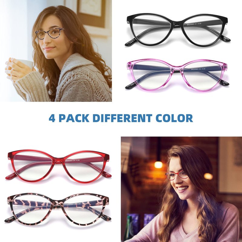 JAWSOCK 4 Pack Reading Glasses Blue Light Blocking for Women,Designer Cat Eye Frame Ladies Computer Readers,Anti Glare/UV Ray Eyeglasses 2.0