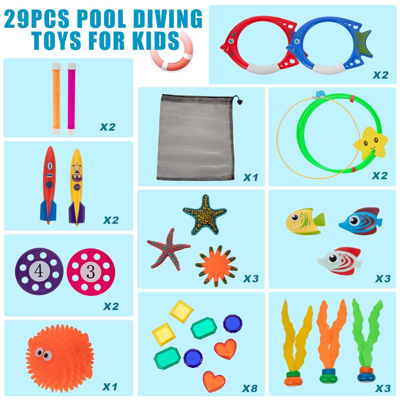 - 【Versatile 29-Piece Diving Set】: Dive into fun with our all-in-one set, featuring 2 diving rings, 1 ball, 2 swim thru rings, 2 torpedo pool toys,2 diving discs, 2 diving sticks, 3 sea grass, 3 starfish, 3 fishes, and 8 diving gems. Made from durable PVC, it's perfect for endless pool play.