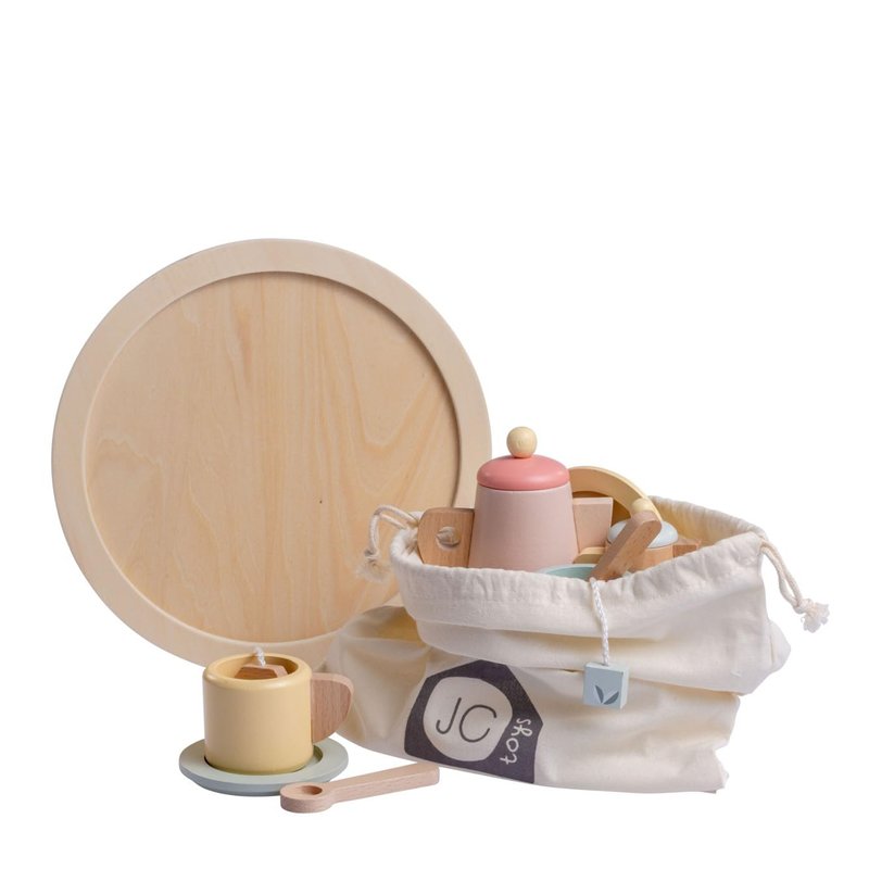 - Real Wood Tea Set includes 12 pieces. Reusable Storage Sac, tray, 2 spoons, 2 tea bags, tea pot, 2 plates, 2 tea cups, sugar jar, milk pitchered