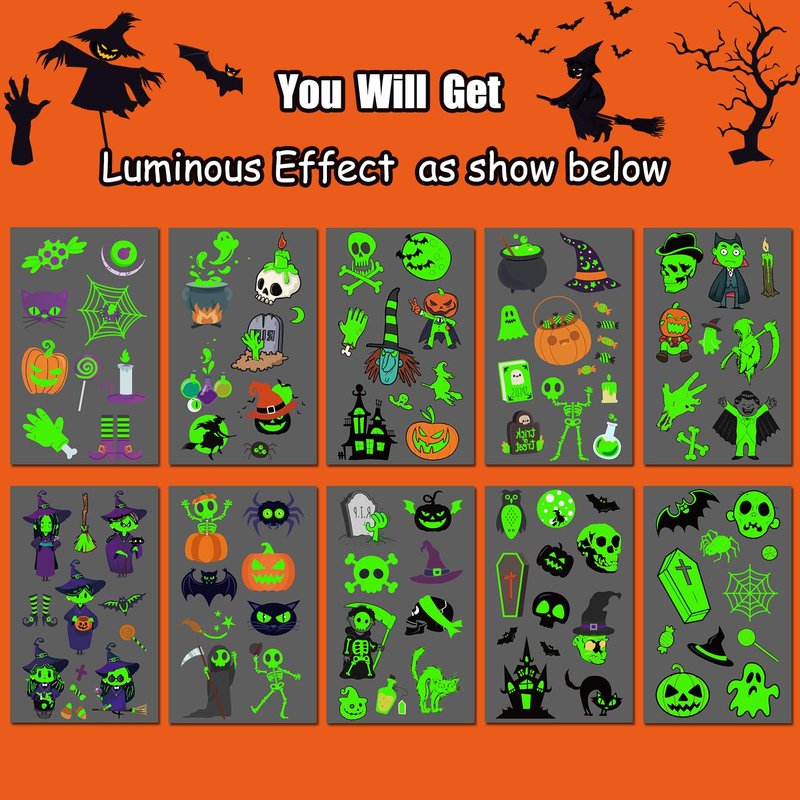 - Glow Halloween Tattoos for Kids Party Favors: These super cute elements in our 10 sheets Halloween temporary tattoos include skeletons, vampire, pumpkins, witches and other Halloween-related patterns! Everyone from toddlers, kids, boys, girls will love these, much fun and cute