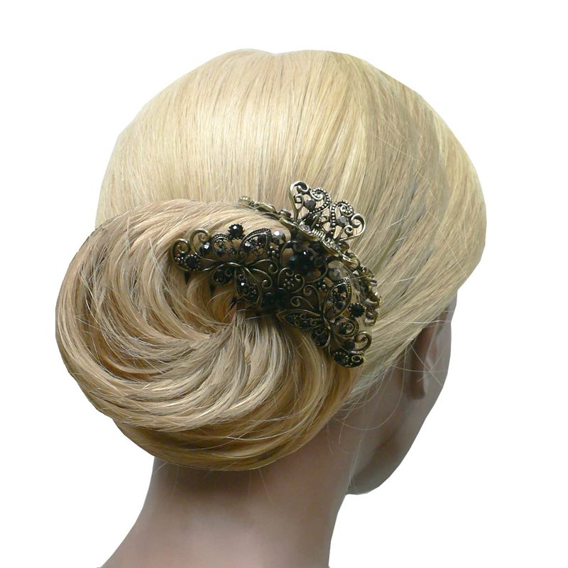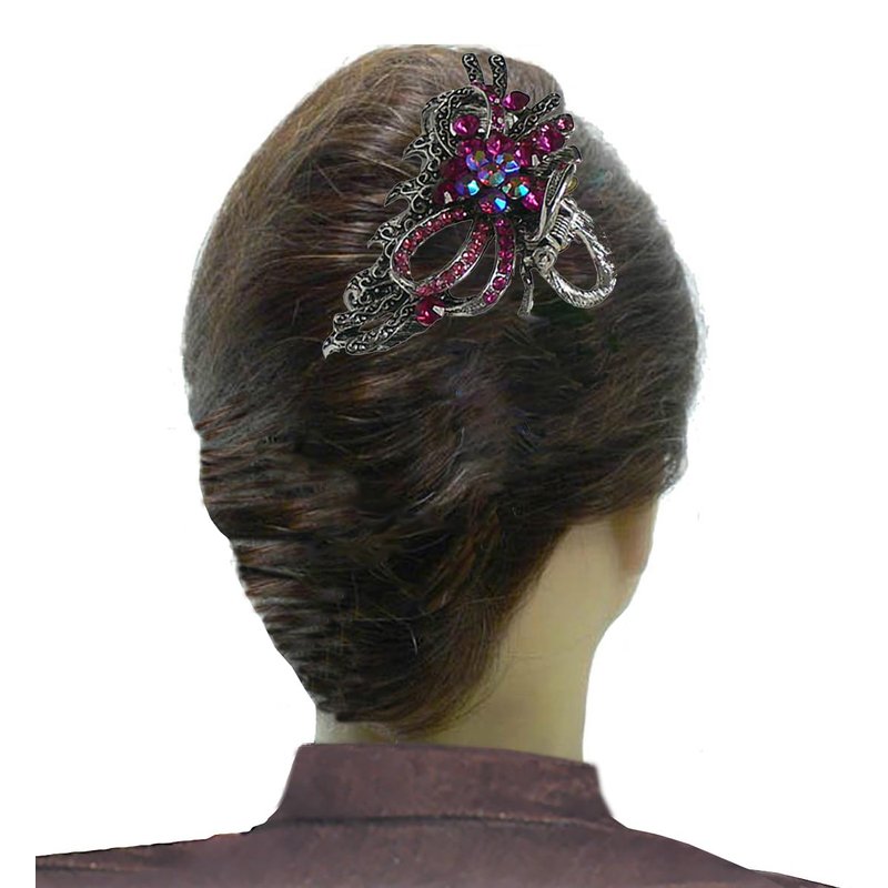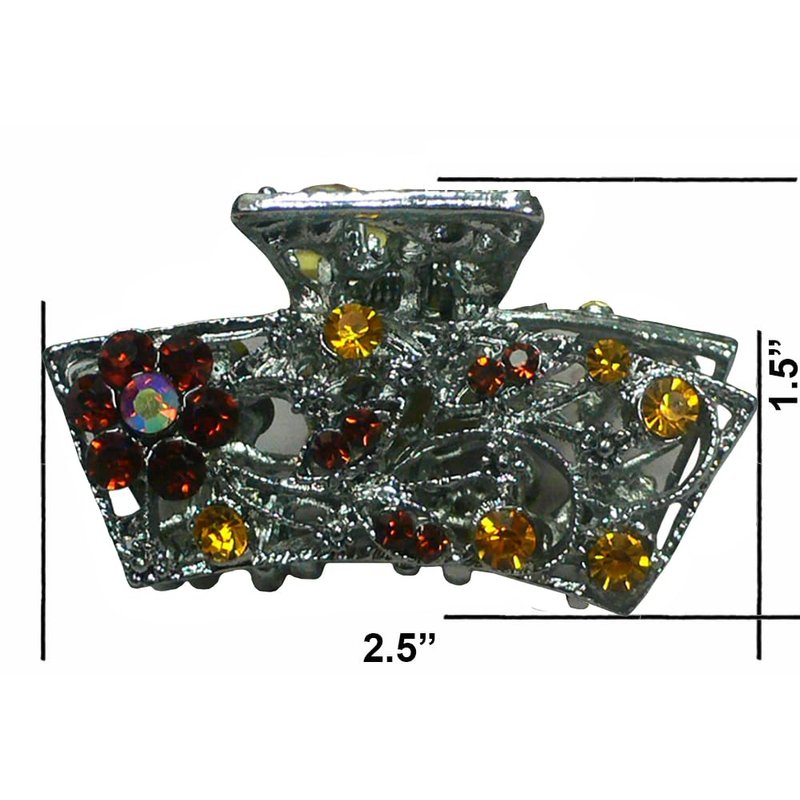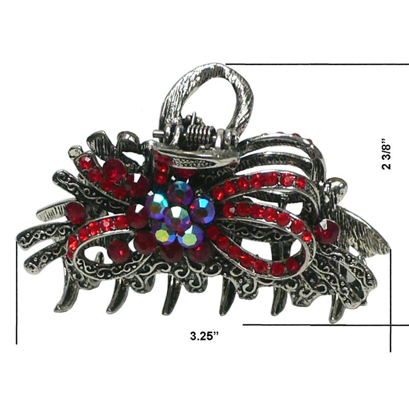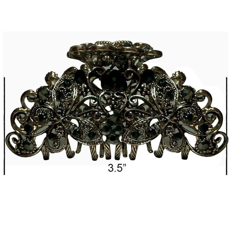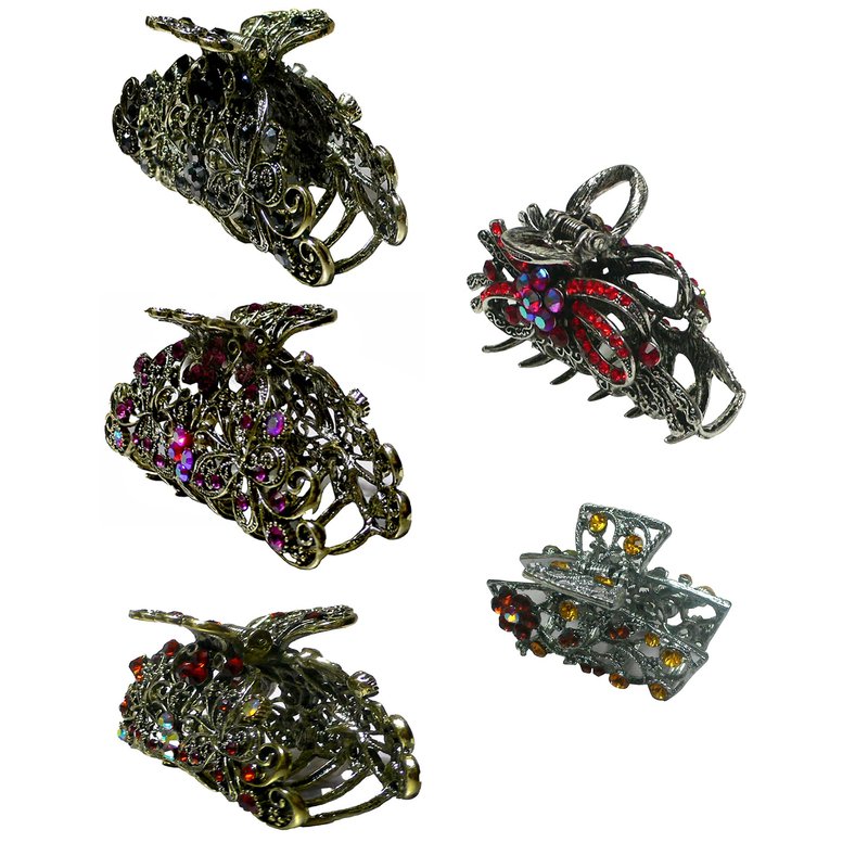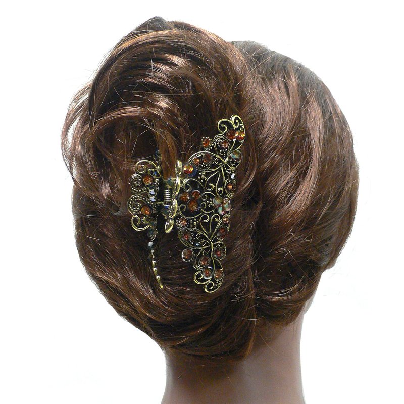 Metal jaw claw clips, combo 2 designs, butterflies and twirling ribbon dessigns, gleamed with sparkly crystals. Butterflies design trimed with antique gold plating color, twirling ribbon trimmed with rhodium plating color. Size is approx. 3.5" x 2" & 3.25" x 2.25" . Strong metal claws for firm grip on hair.