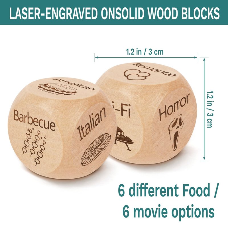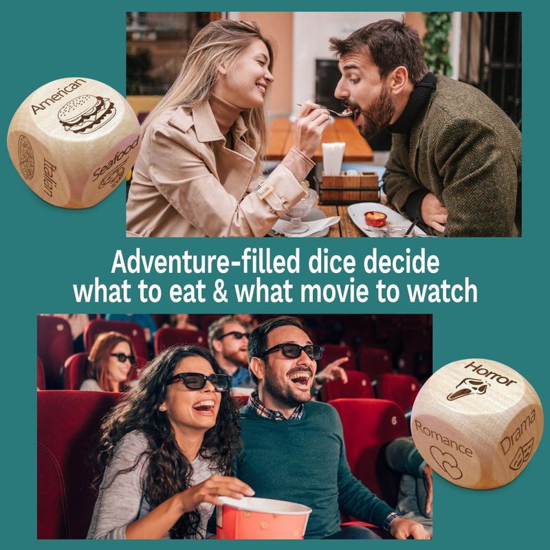 - DINNER AND A MOVIE: These two beautifully crafted solid wood dice include one dice for dining options and one dice for selecting a movie to watch. 36 possible combinations are available to decide the perfect dinner and a movie night for a couple. A great way to add some spice and excitement to your night.