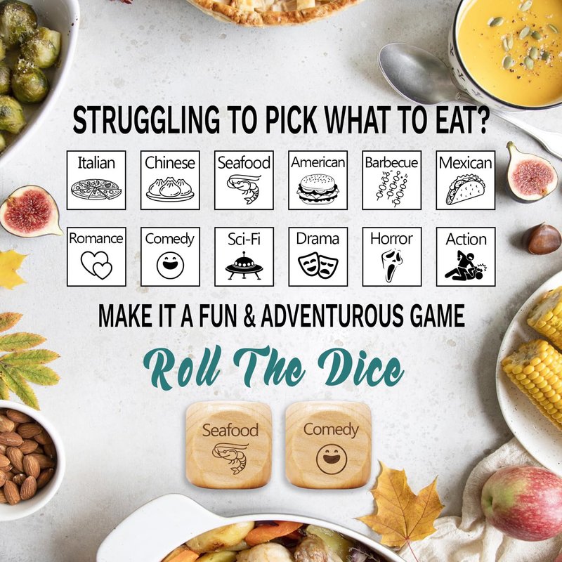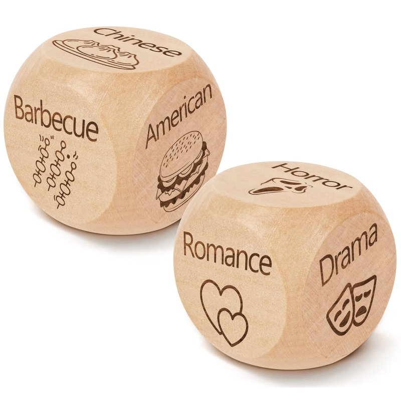 - LET THE DICE DECIDE:Can't decide what to eat or watch on your date?Let the dice decide.One dice features dining options including Italian Chinese Seafood American Barbecue Mexican.Not in the mood for Chinese?Substitute for Thai,Indian or Korean.Roll American?Time for a burger or steak.Roll Barbecue?Try ribs and Chicken.One dice features movie categories with selections of Romance,Comedy,Drama,SCI-FI,Horror,Action