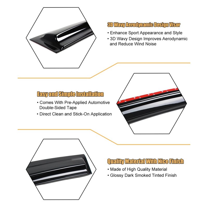 100% Brand New In Box. JDM Dark Smoked Tinted 3D Wavy Sport Window Visors. Comes With Automotive-Grade Tapes For Easy Installation Make of High Quality Material Allow You To Roll Down The Window During Rain/Snow Weather To Get Fresh Air and To Defrog The Glass Help Reduce Heat Buildup In The Parked Vehicles By Allowing Air in During Rainy Weather Help Deflect Rain and Reduce Wind Noise Long Lasting Material Designed To Withstand The Rigors Of The Elements. Dramatically Improve Styling & Appearance. This is Not In-Channel Type Visor. These Stick On The Outside of The Window.