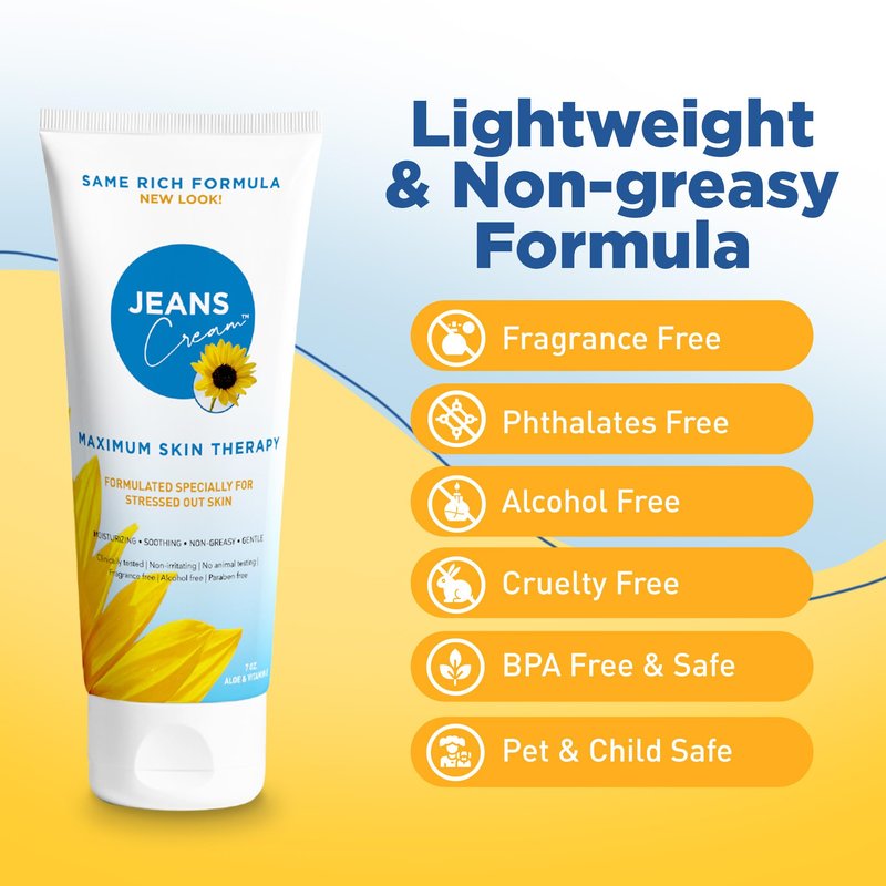 Jeans Cream for radiation therapy is your ally for maintaining nourished skin, especially during challenging times like radiation treatments or recovery from various skin conditions. This burn cream has a mild formula that provides much-needed relief and support for your skin's journey to wellness.Versatile Cream for Multi-target ReliefOur powerful yet gentle cream delivers multi-target relief from various skin concerns.Radiation therapy burnsRednessSwellingSun damagePain and tendernessMinor burns and scrapesItchiness and drynessCosmetic proceduresCracked palms, heels, and feetOther skin conditionsNature inspired FormulaJeans Cream offers superior skin nourishment, enriched with high-potency vitamin E and aloe vera. It is formulated to restore, rejuvenate, cool, and calm stressed-out skin.Non-Sticky and LightweightThe lightweight moisturizing cream for burns ensures that your skin feels comfortable and hydrated without a greasy feel. It absorbs quickly, leaving your skin feeling refreshed.No Harsh IngredientsOur mild formula has no parabens, fragrances, petroleum, lanolin, BPA, or phthalates. It's a cruelty-free product you can trust for your skin health or oncology skincare needs. This gentle cream can be used on children and pets.Variants:Jeans Cream 2 ozJeans Cream 7 ozJeans Cream Gift SetFormulated Specially for Stressed-Out SkinMade with care since 2002, Jeans Cream harnesses the power of vitamin E and aloe vera to deliver soothing relief and defense for dry to delicate skin. Our professional-grade formula is developed and manufactured in the USA. A portion of the proceeds are donated to fund research.Revive and soothe your skin with Jeans Cream!