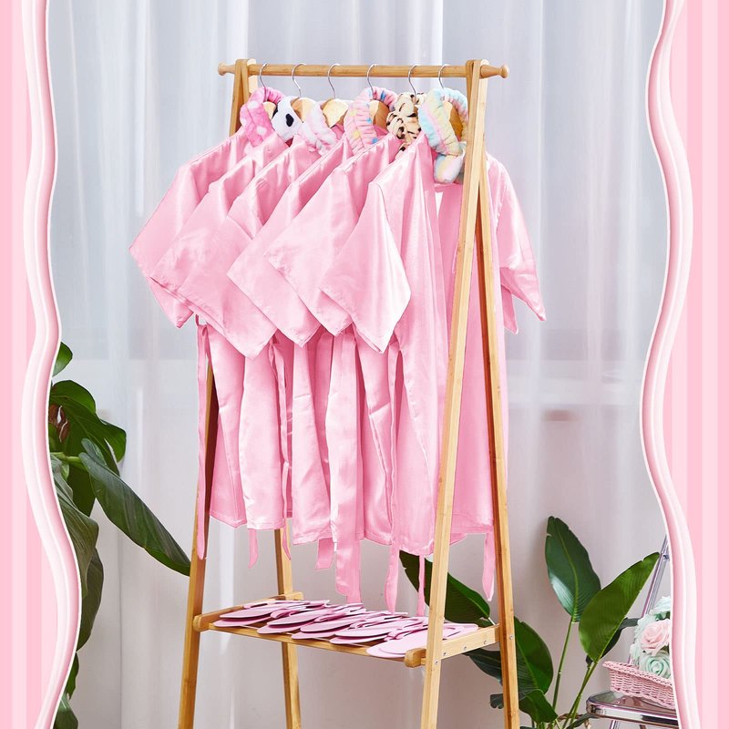 Jecery 18 Pcs Spa Party Supplies for Girls 6 Satin Kimono Robe 6 Spa Headband 6 Disposable Foam Pedicure Slippers (Pink,Size 8)