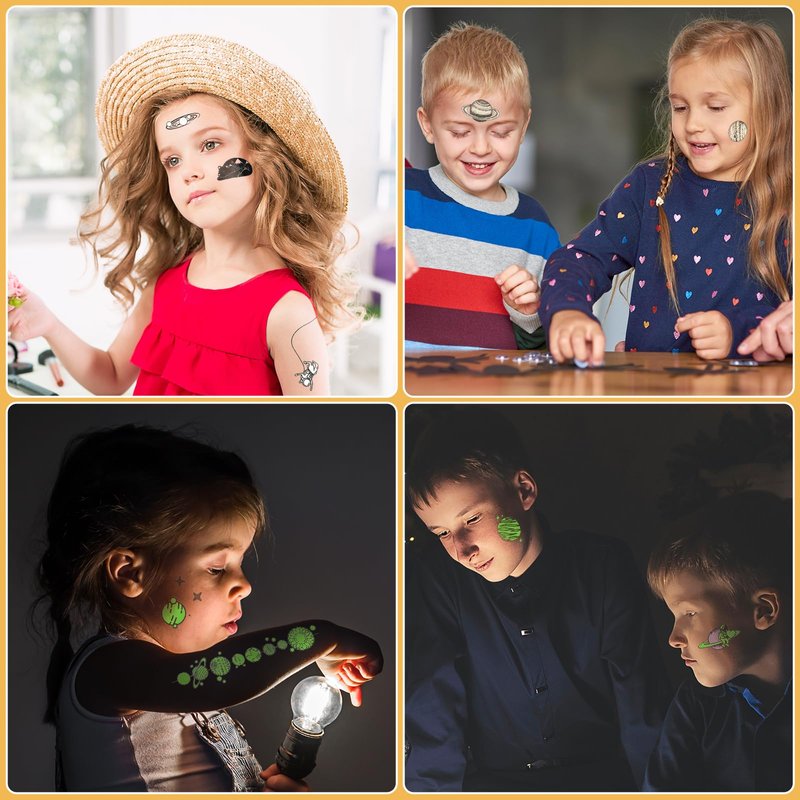 - 【Space-Themed Tattoos】Let your child's imagination fly high with our space-themed tattoos. They can sport adorable planets, rockets, stars, and more on their skin, all adding to the fun.