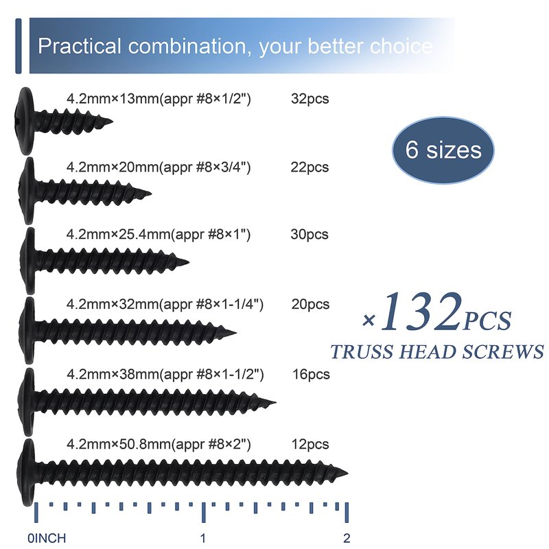JEGONFRI #8 Modified Truss Head Black Wood Screws Assortment Kit, 132 pcs, Phillips Drive, Wood Screws, Screws, Screws Assortment, Screws Set, 6 Sizes (1/2”, 3/4”, 1”, 1-1/4”, 1-1/2”, 2”) (Black)