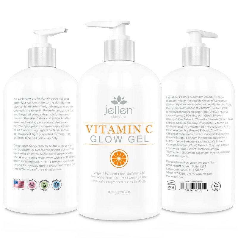 Jellen Vitamin-C Glow Gel enhances conductivity during cosmetic ultrasonic, microcurrent, galvanic, radio frequency, and other non-invasive skin rejuvenating treatments while infusing the skin with powerful skin-brightening antioxidants such as Vitamin C, DMAE, and Alpha Lipoic Acid while refreshing Orange Blossom Water and Hyaluronic Acid improve elasticity and tone. Containing ZERO oils which can block transmission to the skin, this luxe formulation improves surface glide during the facial treatment process.