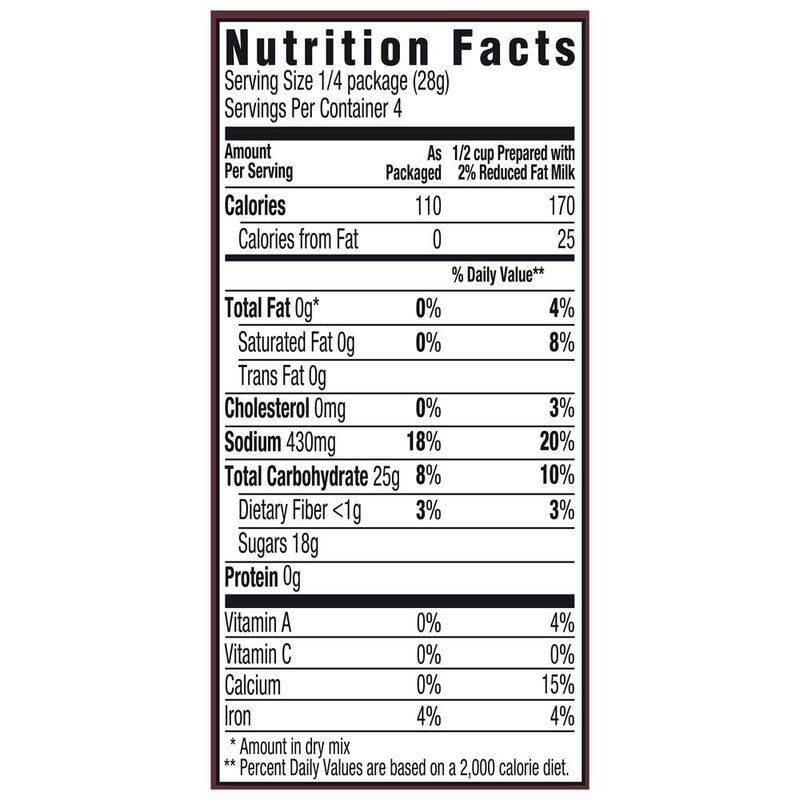- Contains 110 calories per serving; each box makes 4 servings