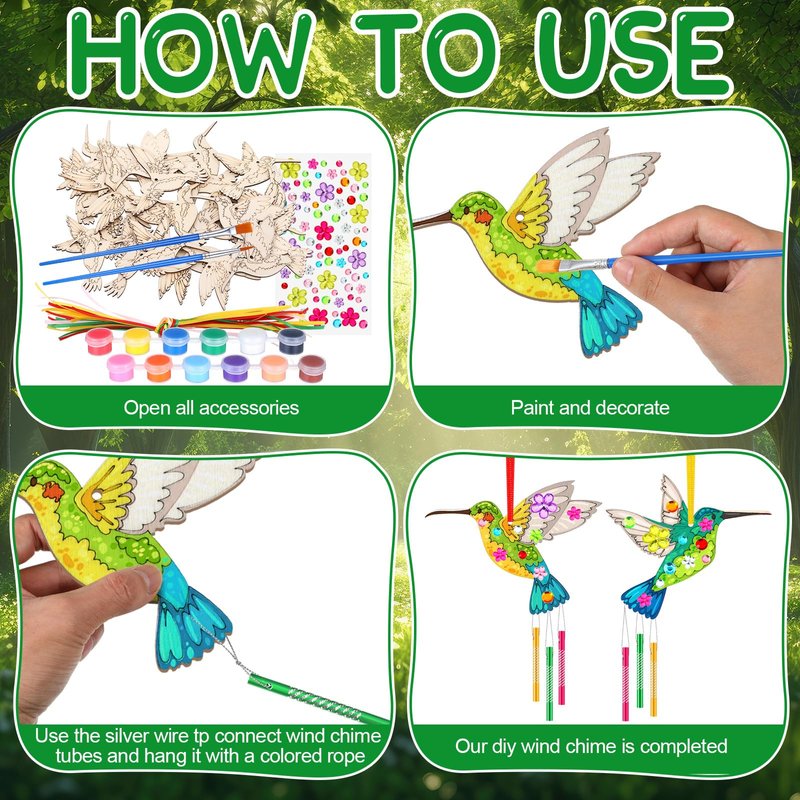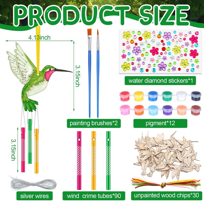 Features: Hummingbird wind chime kit can be made by yourself, or you can make it with family and companions, enjoy the fun of handmade crafts, to improve children's ability, and is also a nice handmade craft. Wooden wind chime crafts are a good choice to give kids as a gift, easy to improve kids' creativity and imagination. Specifications: Main material: wood Color: colorful Size: Wooden wind chime: about 4.5 inches in height Hollow wind chime tube: about 0.24 inches in diameter, 3.15 inches in length Package includes: 30 x Unfinished wooden chips 90 x Wind chime tubes 2 x Painting brushes (with silk thread, stickers and paint) Notes: Manual measurement, please allow slight errors on size. The color may exist a slight difference due to different screen displays. Swallowing risk may exist, please stay away from little kids. Winding risk may exist, please stay away from little kids.