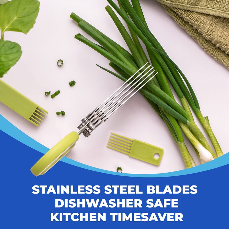 - FIVE BLADE HERB SCISSORS CUT HERBS EASILY: Scissors chop parsley, basil, cilantro, dill, oregano, mint and virtually any leafy green herb with ease. Scissors cut scallions and lettuce. Perfect multi-blade scissors for added flavors & garnishes.