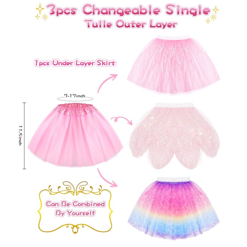 - Tutu Skirt Can be Combined, So Cool: 1pcs multilayer tutu skirt with 3pcs changeable single tulle outer layer. Girls can get different style tutu skirt by layering different skirt veils over the pink multi-layered tutu skirt. Printed skirt veil dotted with little white flowers, center of the flower is sparkling, which is a sunny and lively style; Mermaid skirt veil has gradient color design, which feels like the sea; Ice princess' skirt veil has snowflakes elements on it , full of princess magic
