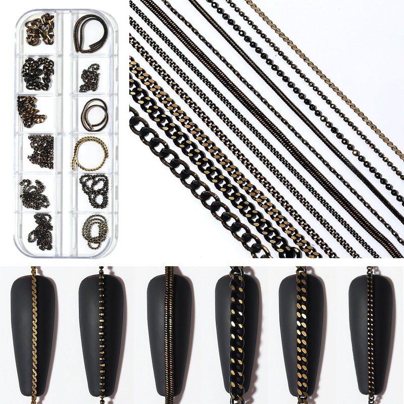 - 【12 Strips Black Nail Chains】: You will receive 12 strips metallic black nail chains, each nail chain is placed in a separate grid for easy distinguish and use. Length range is approximately 6.5-20.5cm (2.56-8.07inch), different styles of chains to create great nail designs. Strong but easy to cut, different styles can meet your different DIY needs to enjoy the fun of nail art.