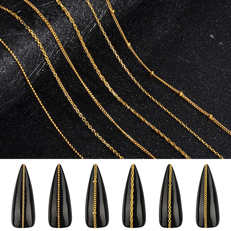 - 6 Strips Gold Nail Chains You will receive 6 strips metallic gold nail chains, each nail chain is placed in a separate grid for easy distinguish and use. Approximate length: 7.48in, 8.26in, 9.25in, 10.62in, 11.02in, 12.99in, different sizes of chains to create great nail designs. Strong but easy to cut, different styles can meet your different DIY needs to enjoy the fun of nail art.