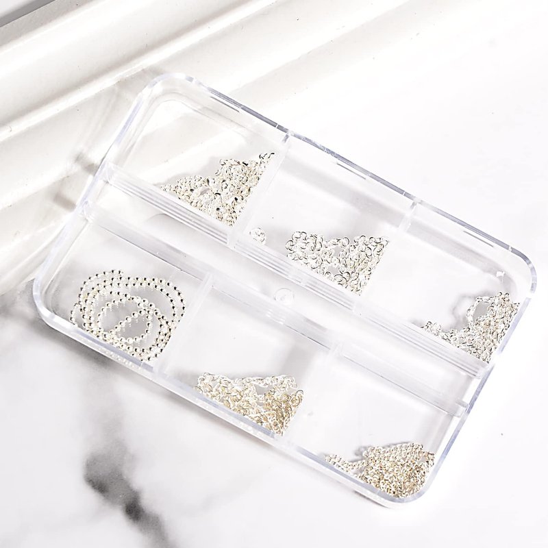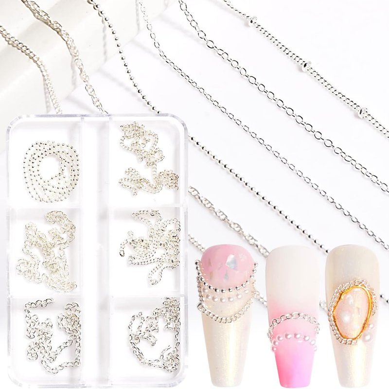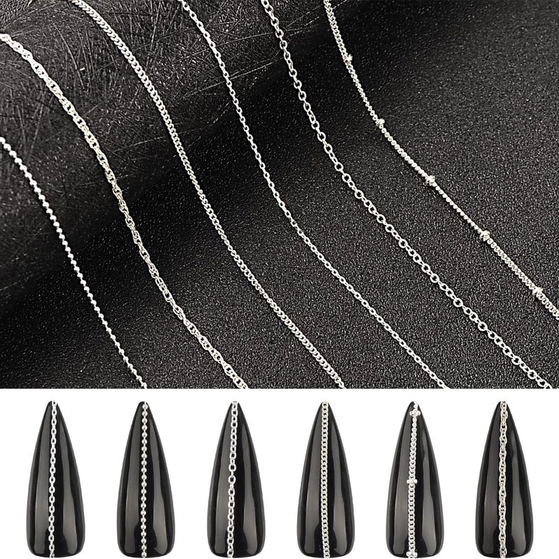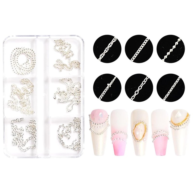 - 【6 Strips Silver Nail Chains】: You will receive 6 strips metallic silver nail chains, each nail chain is placed in a separate grid for easy distinguish and use. Approximate length: 7.48in, 8.46in, 8.66in, 8.85in, 10.82in, 11.22in, different sizes of chains to create great nail designs. Strong but easy to cut, different styles can meet your different DIY needs to enjoy the fun of nail art.