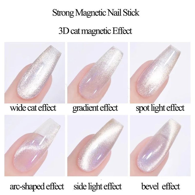 - 【How To Use】:First, apply CAT EYE GEL POLISH; second, place the magnet on your nails for 10-15 seconds to get a cat eye effect (please keep the magnet side facing your nails, the closer you can, but do not touch the nail surface); third, immediately with UV light for 2 minutes or LED light for 60 seconds.