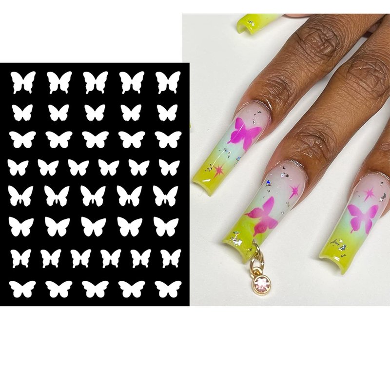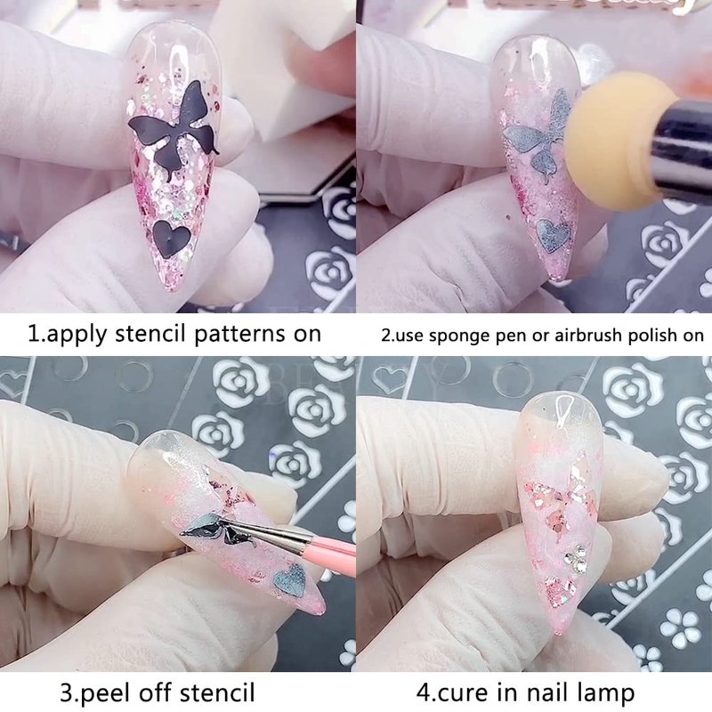 - ⭐💕🦋【Easy To Use】These nail art decals are self-adhesive. Pick up the airbrush stencil nail sticker and place the stencil sticker on your nail tips apply nail powder over the stencil sticker and peel off the nail stencil sticker. Easy and time-saving.