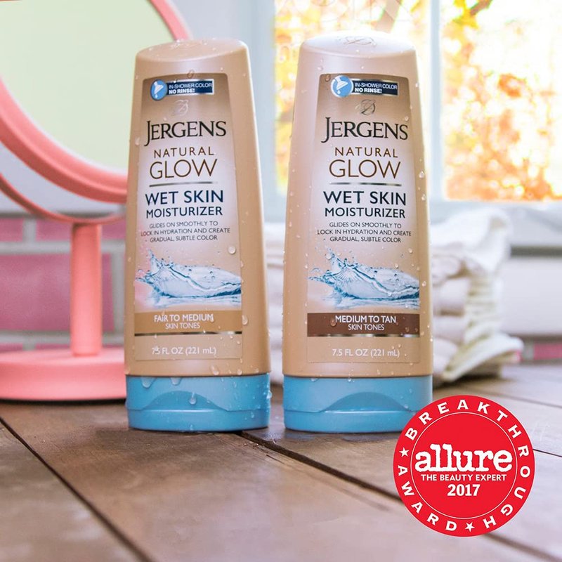 • GRADUAL SUNLESS TANNING - Jergens Natural Glow Wet Skin Moisturizer glides on smooth for in-shower application, and develops color with minimal transfer or drying time