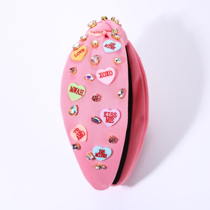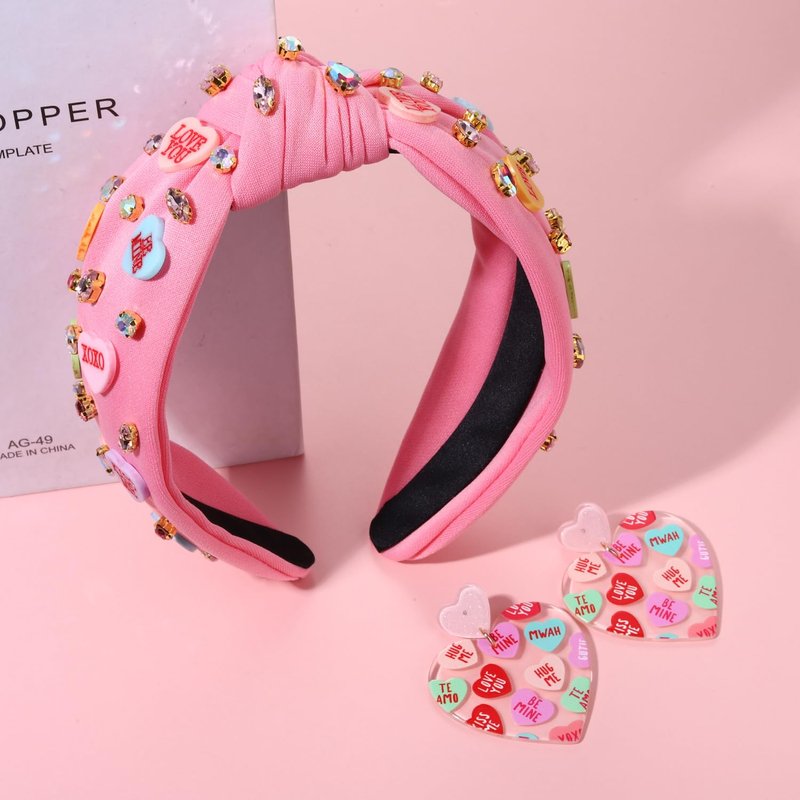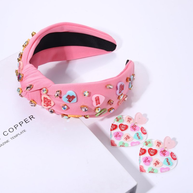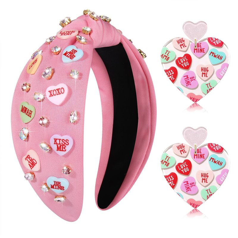 - Get ready for Valentine's Day with this Valentine's Day Headbands.Wide top knot headband features shimmering crystal rhinestones and charms of classic conversation hearts printed all over with message like"Be Mine,"Cutie,""XOXO","Love" and so on.Matching with a pair of Valentine's day heart earrings.This Valentine's day accessories set is a super easy way to dress up your outfit and let your guy know that you're ready for a flirty and romantic evening!