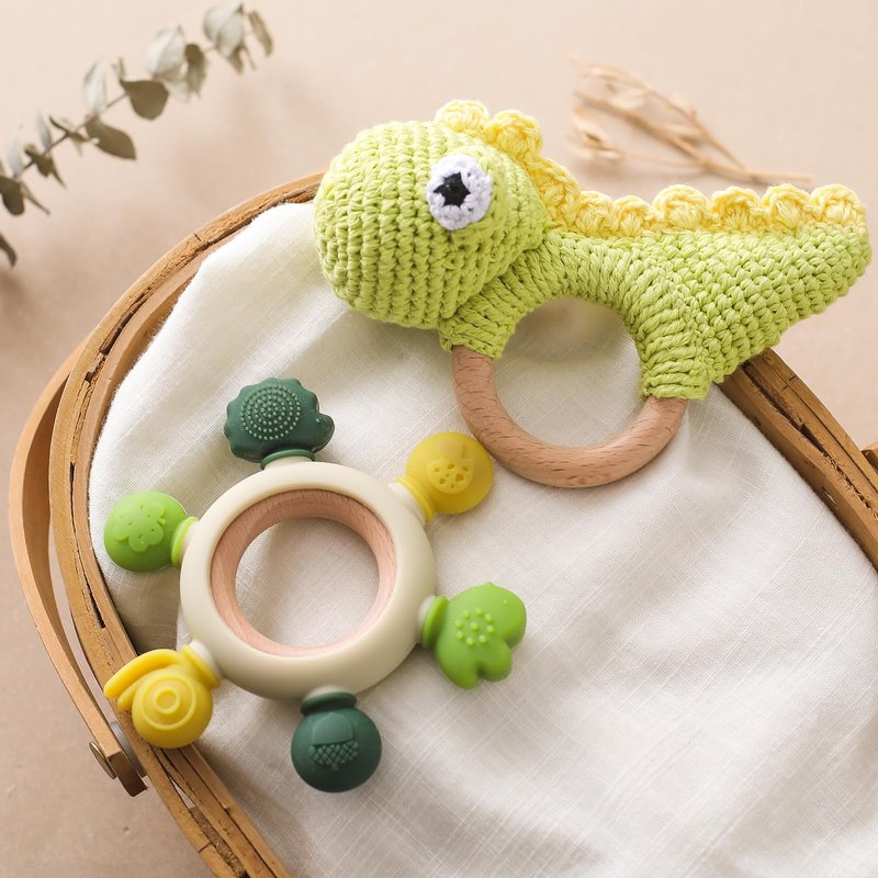 JETM·HH Teether Ring Wooden Baby Rattle Crochet Green Dinosaur Set | Infant Teething Toy | BPA Free Silicone Chewable Rings with Organic Featuring Multiple Textures | Crochet Rattle Baby