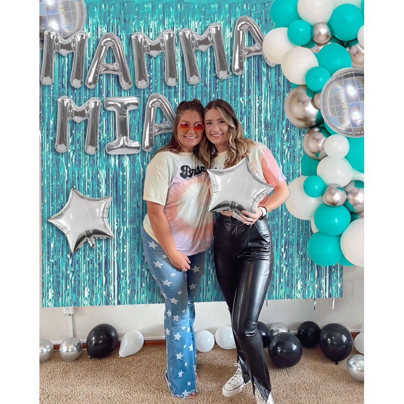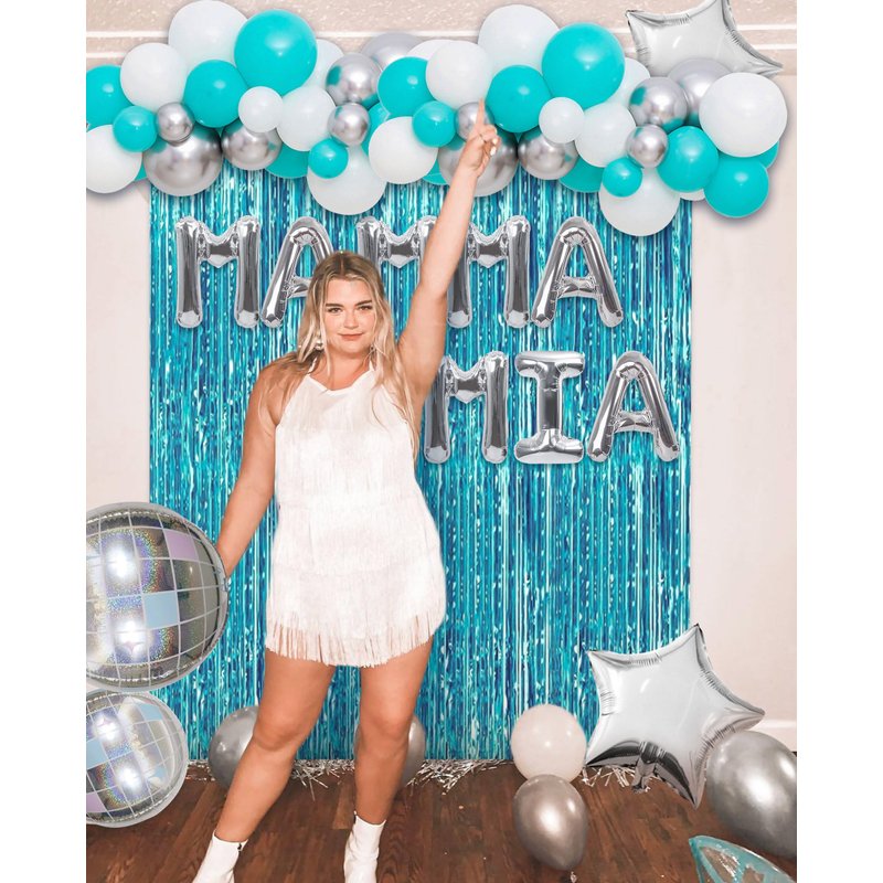 - What you will receive: 1 x Mamma Mia Letter Balloons, 2 x disco balloons, 2 x sliver stars, 1 x blue curtain, 65 x latex balloons for garland.