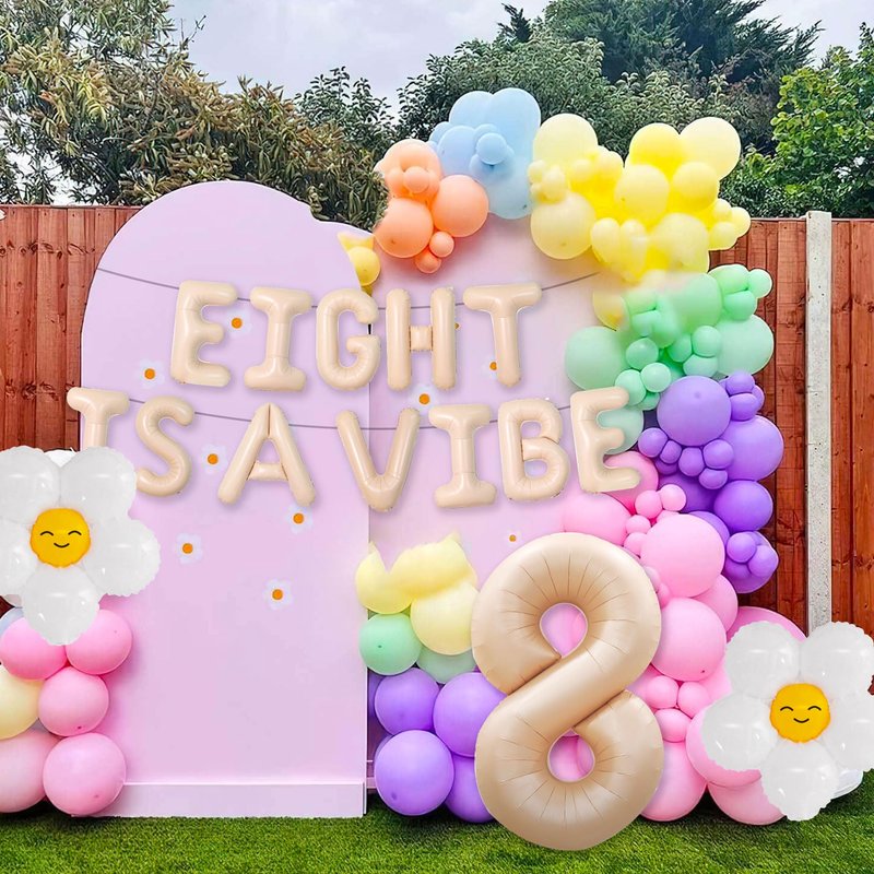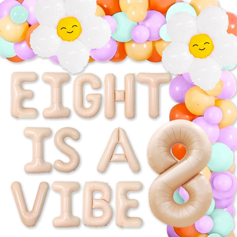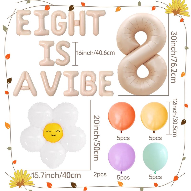 - You will get: 1 x “EIGHT IS A VIBE” balloon,1 x number “8” balloon, 1 x daisy shaped balloon, 5 x orange balloon, 5 x yellow balloon, 5 x purple balloon, 5 x blue balloon. Size as picture shows