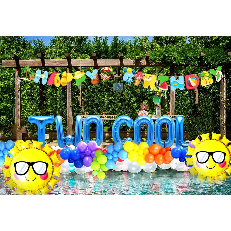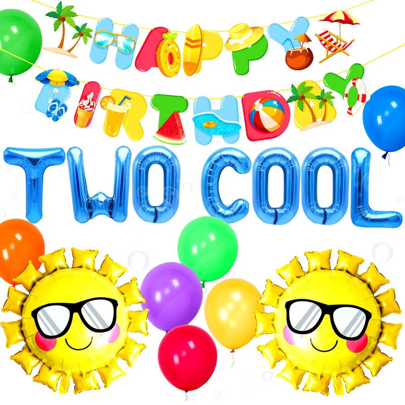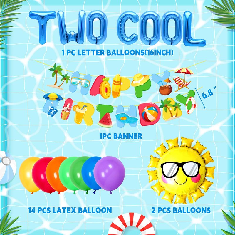 - What you will receive: 1 x Two Cool letter Balloons, 1 x beach birthday banner,14 x latex balloons, 2x sun balloons.