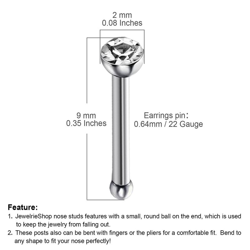 - REGULAR SIZE: About 9mm / 0.35 inch Length; Pin Thickness: 0.64mm / 22 Gauge, 2mm Crystal. Cool Size for Your Nose and Easy to Put On, Shiny Crystals Make Your Nose More Sexy and Attractive. Our stainless steel nose bone is also bendable and flexible. The bendable pin is about 7mm long. These posts can be bent with fingers or the pliers for a comfortable fit. Bend to any shape to fit your nose perfectly!
