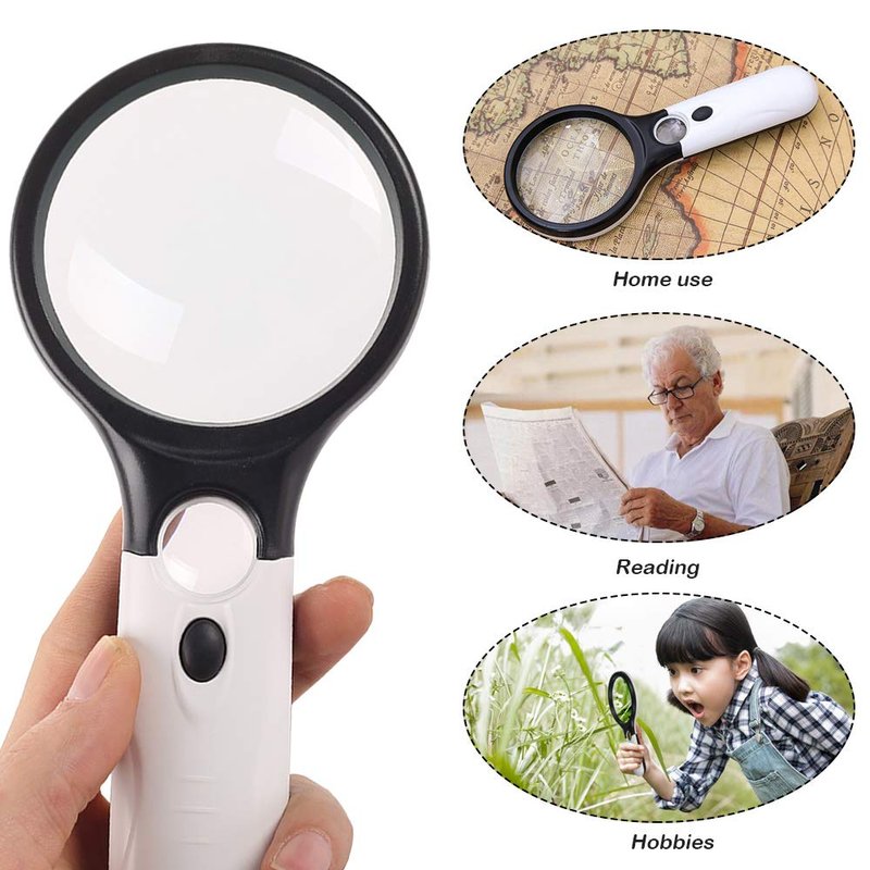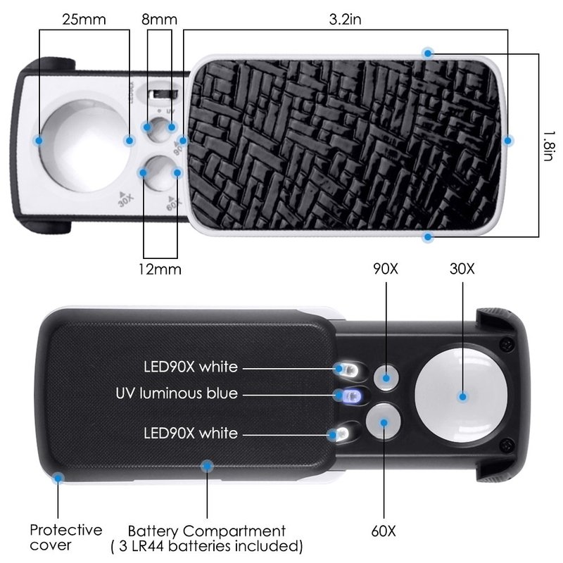- 3 THREE MAGNIFICATIONS: 30X (25mm), 60X (12mm), 90X (8mm). The magnification is changeable according to the distance between the reading material and the magnifying glass, and the user can freely adjust the limit.
