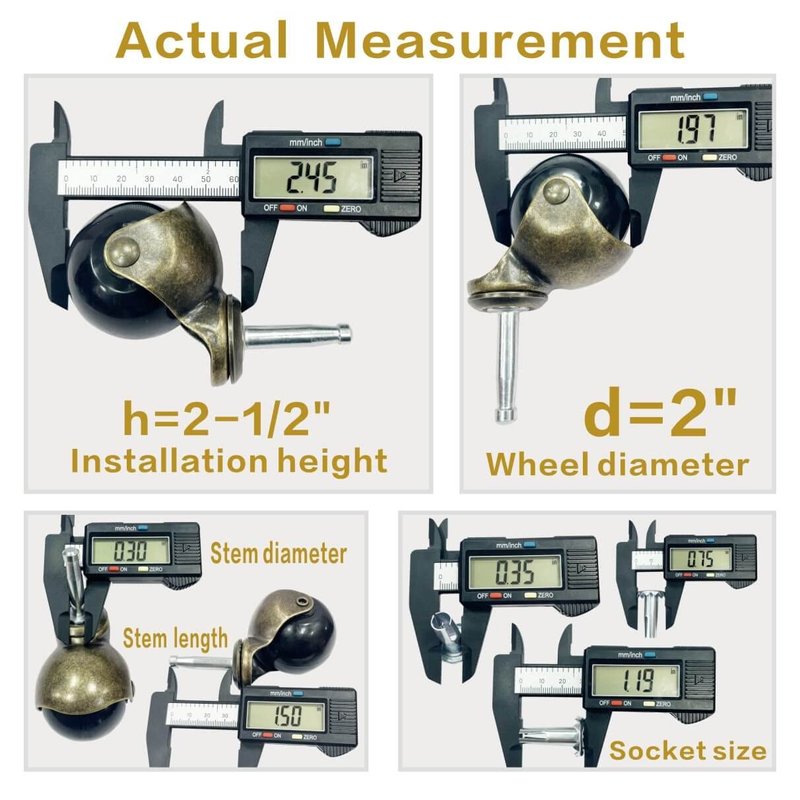 - DIMENSION & WHEEL SLEEVE -- Swivel antique wheel diameter is 2", stem diameter 5/16" (0.3"), stem length 1-1/2" (1.5"), installation height 2-1/2" (2.45"). Package includes 2 inch stem caster wheels 4 pack and 4 sleeves. (Please see the specific sizes in Figure 2)