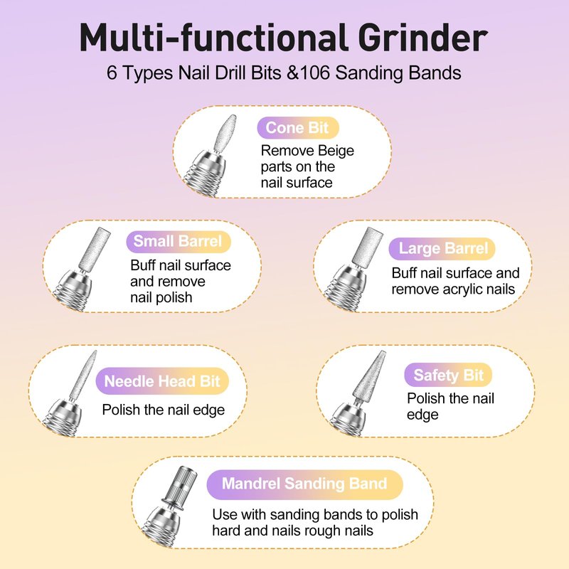 - Practical Acrylic Nail Kit: Electric nail file equipped with 6 nail drill bits and 100pcs sanding bands, meet all your demands for acrylic gel nails, dip powder nails and poly nail gels, works effective for polishing, shaping and removing
