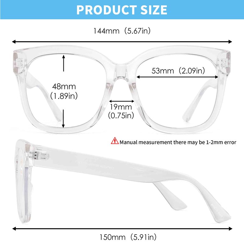 - Dimension: Lens width: 53mm/2.08inch, Lens Height: 48mm/1.89inch, Bridge width: 19mm/0.75inch, Arm length: 150mm/5.9inch.