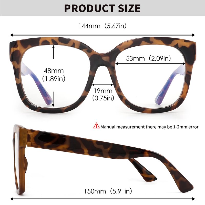 - Dimension: Lens width: 53mm/2.08inch, Lens Height: 48mm/1.89inch, Bridge width: 19mm/0.75inch, Arm length: 150mm/5.9inch.