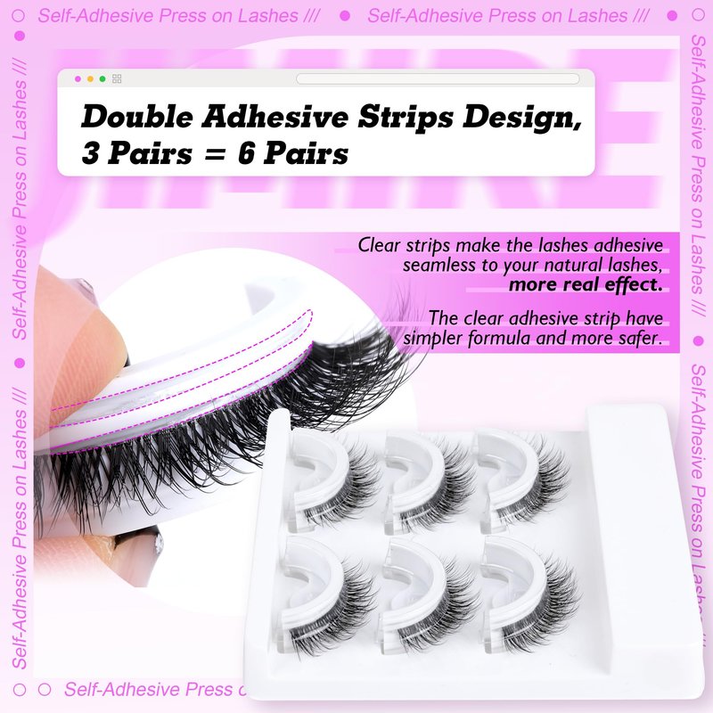 JIMIRE Self Adhesive Eyelashes Clear Pre-Glued Mink Lashes Fluffy Russian D Curl Strip Lashes Natural Look Like Eyelash Extensions Wispy Press-on Self- Adhesive Lashes 3 Pairs Pack