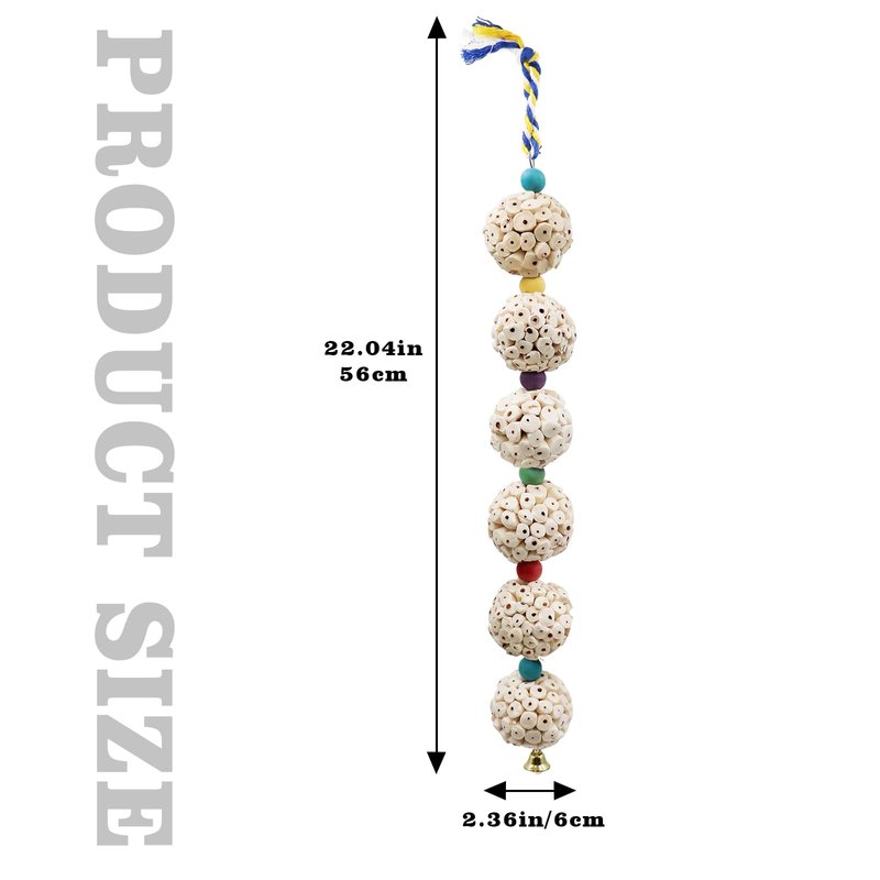 - Colorful and Auditory Delight: Each parrot chewing toy string comprises 6 sola balls separated by colorful wooden beads. At the bottom, a metal bell adds an auditory element, creating a pleasant sound when the bird indulges in chewing—an enticing and multi-sensory experience.
